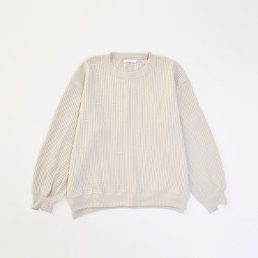 柔らかく程よい肉感のニット素材を使用したワッフル柄のニットソーになります。一枚での着用も、インナーとしても使い易い様に程よくゆったりとしたシルエットに仕上げており、ふっくらとしたボリュームと保温性の他に軽量感のある着心地が特徴となっております。裾のスリットの他に、袖口リブにもスリットを入れたさりげないアクセントが、シンプルになりがちなコーディネートのインナー等にもお使い頂けます。一般的なニットに比べて、家庭用洗濯機で水洗いが出来るイージーケアな点も特徴です。