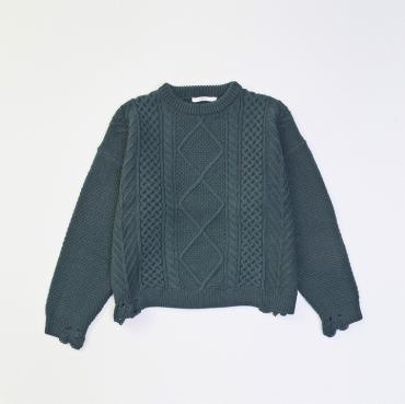 アクリルウールの糸を3ゲージに編み込んだケーブルニット。身幅を広げて、肩を落としたオーバーサイズに仕上げております。非常に柔らかく、着心地の良い仕上がりとなっております。両身頃はケーブル柄で袖口や裾部分にはダメージを設けており、他にはない仕上がりとなっております。袖のダメージ部分に指を通してグローブ代わりの防寒性の他に、アウターの袖から見せるコーディネートを提案しております。ルーズシルエットでドロップショルダーがアクセントとなっており、カラバリも豊富なので、インナーは勿論ですが、ぜひ一枚でもゆったりと着ていただきたいアイテムです。