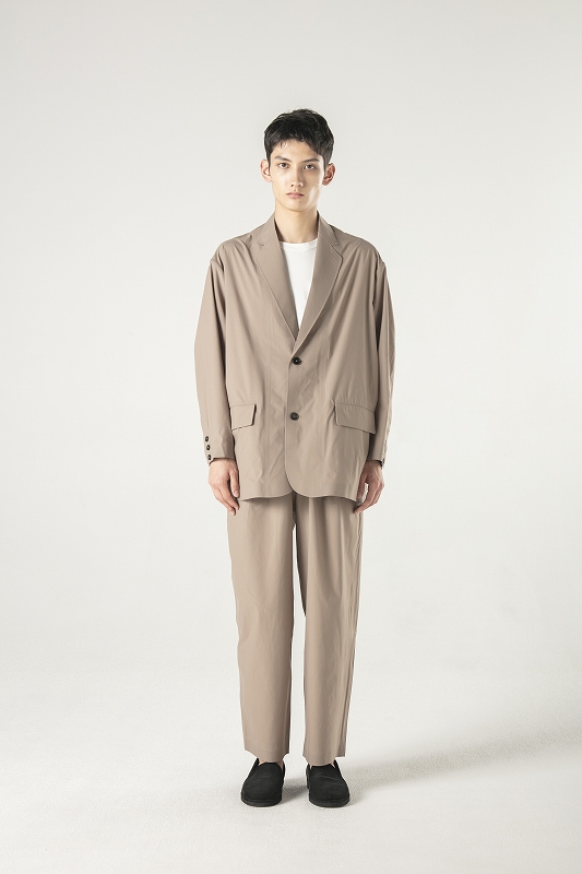 シームレスで仕上げたワイドシルエットのスラックス。ストレッチの非常に優れた合繊素材を使用しており、非常に軽量で柔らかく、シワになりにくい仕上がりとなっており、清涼感のある生地で、ベルトが要らず、ストレスなく着用していただけます。ワイドなシルエットで仕上げており、ウエストにはゴムと紐が付いており、部分的にシームレスの仕様で作成しております。同素材のジャケットとセットアップで着用していただけます。