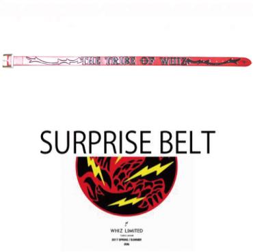 WhizLeathersに製作を依頼したSURPRISE限定の赤いレザーにブラックの刻印のスペシャルモデル。久しぶりにベルトを製作しました。一番欲しいカラーでわがままな仕上がり。毎朝パンツを履くときに楽しいと思えるベルトはいつも最高のものを。そんなチラリと見えるベルトは一生一緒にいてくれる、そんなアイテムです。シルバーのバックル、レッドのレザーに「THE TRIBE OF WHIZ」と刻印(カービング)が全体に入ります剣先にはWhizLeathersのマーク、裏側にはロゴの刻印が入ります。