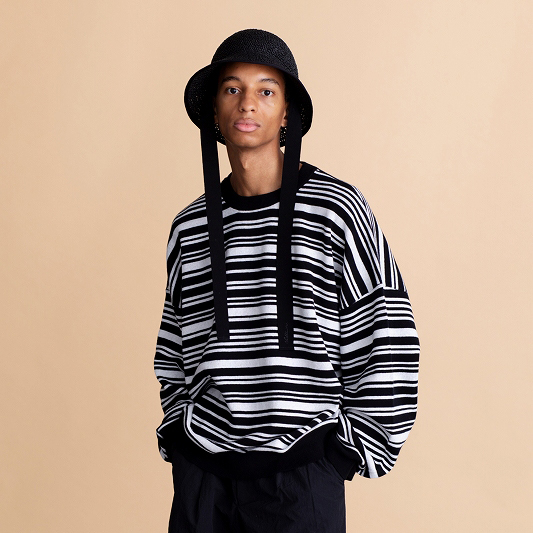 コットンの糸をダブルジャガードで編み立てており、落ち感がありつつも、スウェットの様にボリュームを持たせております。ジャガード編みによる裏目がボーダーの柄の中に混ざって杢調な仕上がりとなっております。非常に肌触りが良く、ドロップショルダーでオーバーサイズシルエットを際立たせており、シンプルながらに一枚でも主役になれる使い勝手の良い一着です。