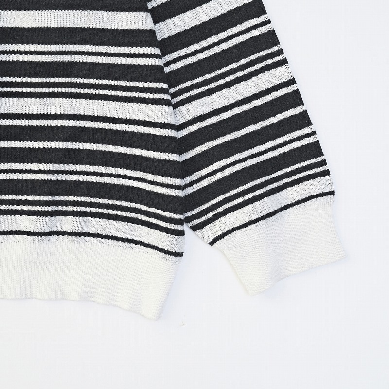 コットンの糸をダブルジャガードで編み立てており、落ち感がありつつも、スウェットの様にボリュームを持たせております。ジャガード編みによる裏目がボーダーの柄の中に混ざって杢調な仕上がりとなっております。非常に肌触りが良く、ドロップショルダーでオーバーサイズシルエットを際立たせており、シンプルながらに一枚でも主役になれる使い勝手の良い一着です。