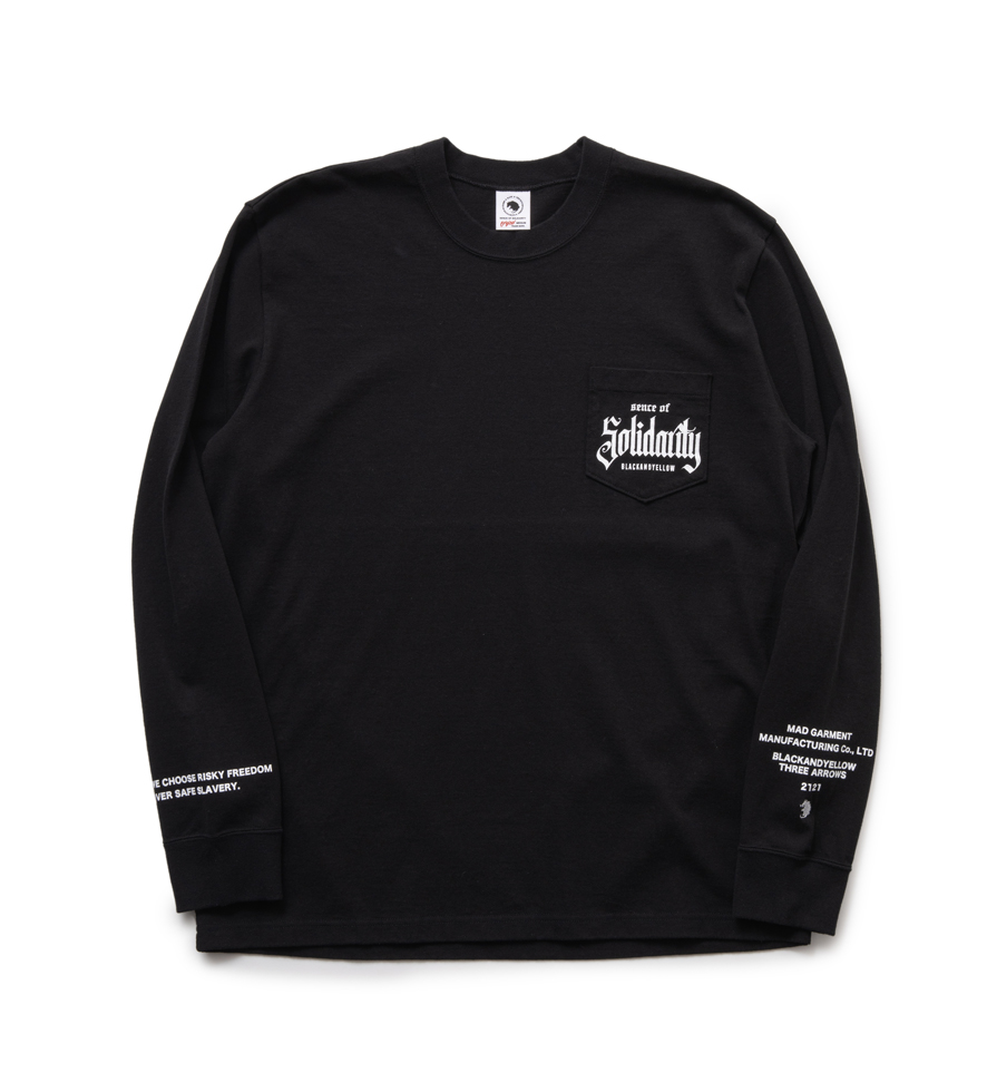 8.5オンスのコットン天竺のオリジナルボディーを使用したロングスリーブTシャツ。左胸ポケット・背面にSENSE OF SOLIDARITYのグラフィック、両袖口にメッセージグラフィックをラバープリントを施し、左袖にはRATSモチーフをワンポイント刺繍で表現したメッセージ性の高いデザイン。ネックはロックネック仕様。