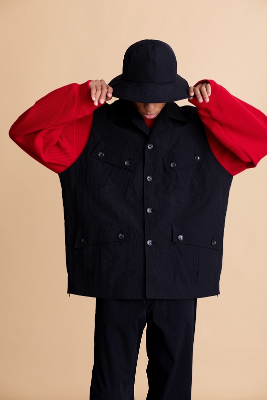 人気のファティーグジャケットをベストにした現代的なデザインで、オーバーサイズのリラックスウエアに仕上げました。ワッシャー加工による生地に清涼感があり、撥水加工を兼ね備えた、見た目以上の機能素材となっております。