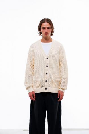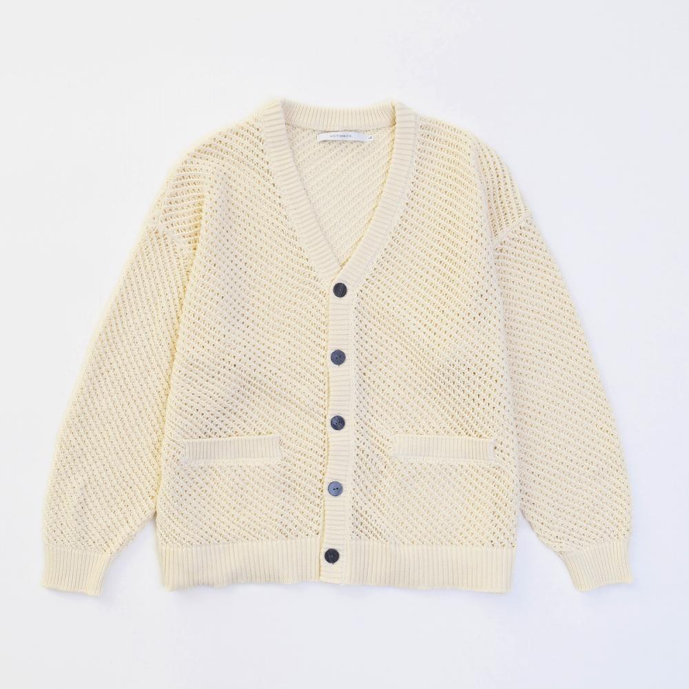 透け編みの目を斜めに編み、あえて着丈などを左右で斜行させる事で、シンプルながらに少し違和感を感じることの出来るニットとなっております。ゆったりとしたシルエットとなっており、季節に合わせて透け感を持たせており、シンプルになりがちな夏のコーディネートの主役になる一着です。