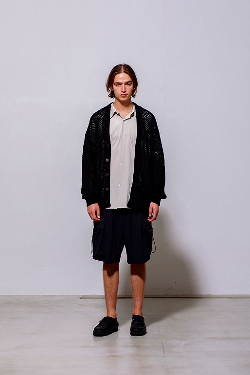 透け編みの目を斜めに編み、あえて着丈などを左右で斜行させる事で、シンプルながらに少し違和感を感じることの出来るニットとなっております。ゆったりとしたシルエットとなっており、季節に合わせて透け感を持たせており、シンプルになりがちな夏のコーディネートの主役になる一着です。
