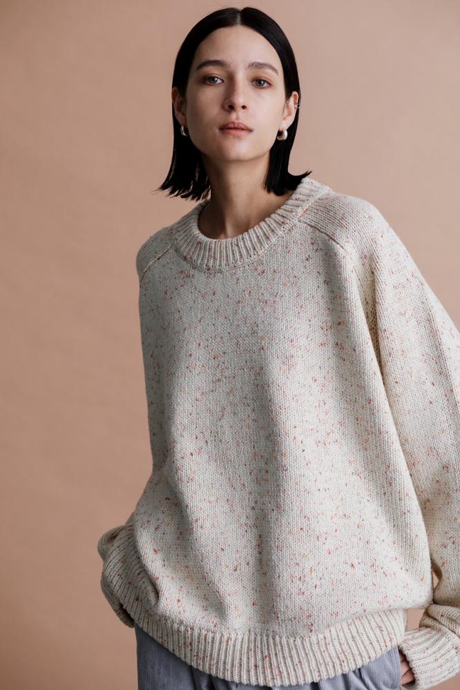 メランジの糸をローゲージで編み立てたクルーネックニット。