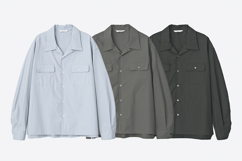 オーガニックコンパクト糸を使用したオープンカラーシャツ。ミリタリージャケットを上品な生地で清涼感のある開襟シャツに仕上げました。肘にはミリタリーアイテムに見られるタックが入ります。裾はフラットでワイドなシルエットに仕上げております。