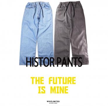 ゆったりしたデニムパンツ。軽くて柔らかくて夏にも履きやすい風合いの薄いカラーの8オンスの弱ムラデニムを使用。ウエストはゴムとコードで楽ちんなリラックス感もポイントです。デニムは定番の縦落ちを意識したものではなく、どちらかというとフラットな打ち込みで凹凸が出ないような仕上がりに。バイオウォッシュで色を落としているのでステッチのアタリがでています。オリジナルボタンもステッチもこだわりが詰め込まれたデニムパンツをお楽しみくださいね。バックポケットには心電図ステッチが嬉しいデザイン。オリジナルキーパーツ、オリジナルジップ、コードの先にはWHIZLIMITED。そんなこの春夏の主役の一本をお見逃しなく。