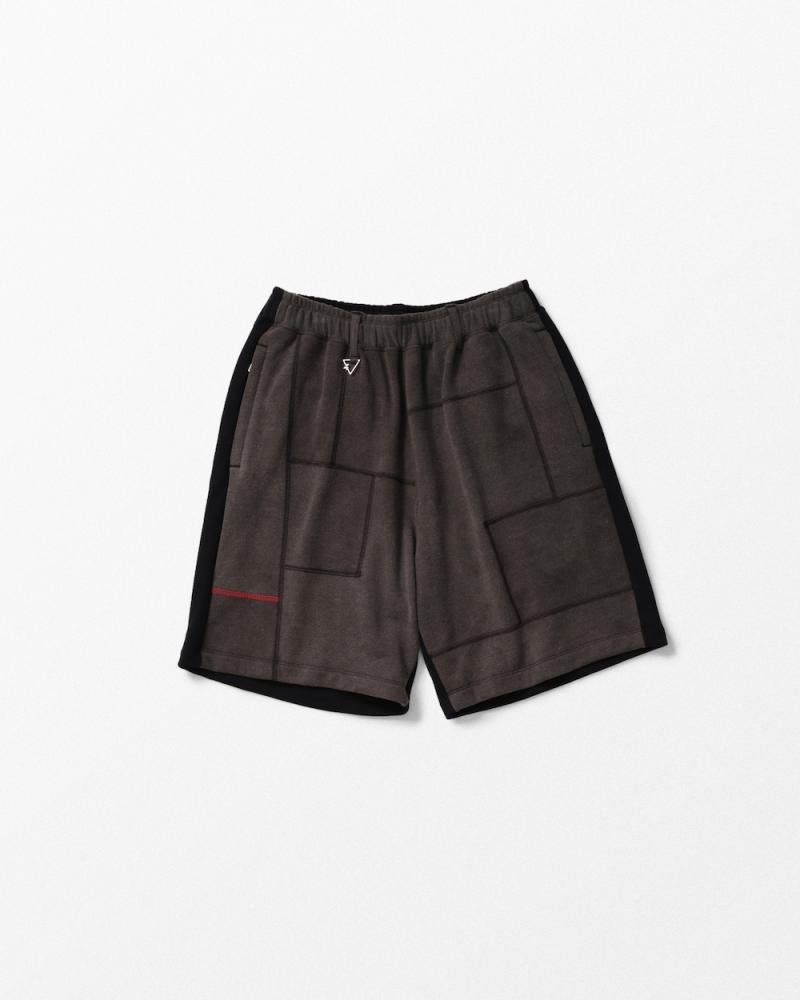 パッと見た時から一目ぼれをしたスウェット生地、で製作された最強のショートパンツ。こんなに難しい事をしてるのを見たことがなかったので驚きました。これ全部が継ぎ接ぎになったパネルによって加工感が異なるすごい一枚。「ツギハギジャン」と聞いて納得、というかこんなの出来るんですね。パターン数と仕様の難しさは過去類を見ない完成度で半端ないです。「完璧」というのも納得のすごさは是非手に取ってお楽しみください。着古したような雰囲気のスウェットの切り替え部分に少し濃い色の配色のステッチが通っています。右袖には赤ステッチが一本入りポイントに。生地は裏毛素材に特殊加工を加えてUSED感ある仕上がりに。フロントはツギハギデザイン、でバックは無地の単色ですので前後の違いが大きい仕様です。夏の主役のショーツ、それをスウェット、さらにこのツギハギパッチワークで、なんて最高に決まっています。フロントポケットがジップになってるこだわりにもご注目ください。どうぞお試しくださいね。