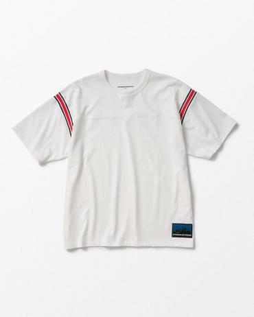 WHIZといえばな半袖アイテム1つであるフットボールTシャツ。形を変えてそのシーズンを現すいつも見逃せないTシャツです。新作はゆったりサイズで使いやすいこんな仕上がり。アームホール部分には編み立てた配色ラインリブを使用してラインでWHIZらしい存在感があります。ドライタッチな風合いと程よい肉感のボディーにデザイン、ベストと合わせてラインリブを出して見せて配色に使える主役の一枚。胸と背中の切り返しでより程よいボリューム感がありまます。そしてえ裾には嬉しいシルエットネーム。こだわりがたっぷりのフットボールTをどうぞお楽しみくださいね。