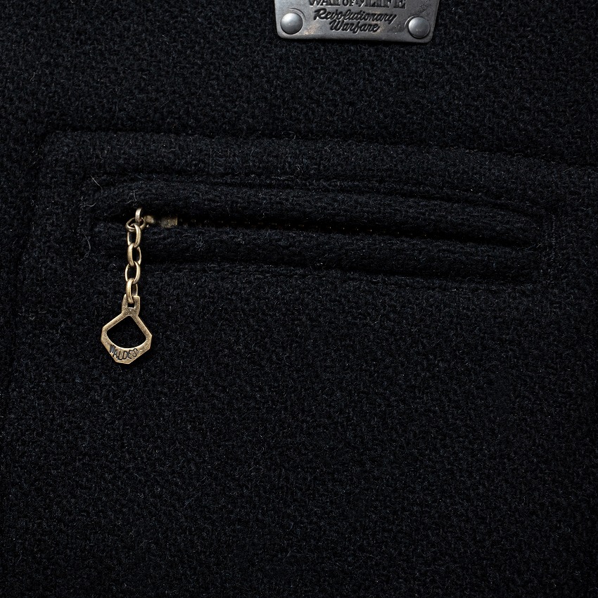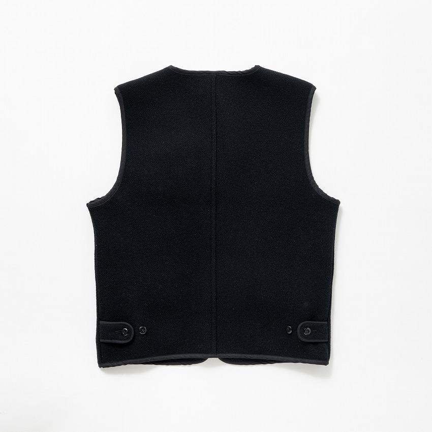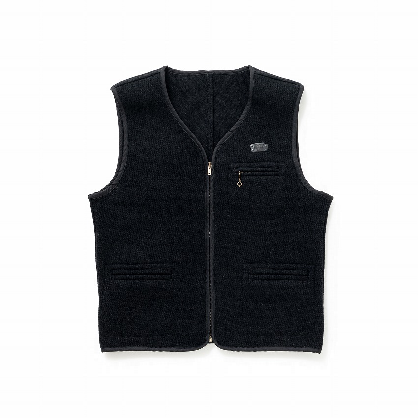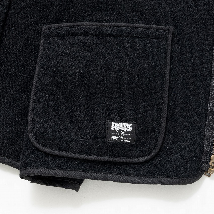 メルトンウールを使用した、RATSが定番でリリースするファミリーベスト。左胸にジッパー付きのポケット、両裾にスリットポケット、左胸ポケット上部にRATS刻印入りメタルプレートを配置。襟・前立て・裾、アームホールにパイピングを施した仕様。WALDES社製ジッパーを使用。身幅はややタイトなシルエット。
