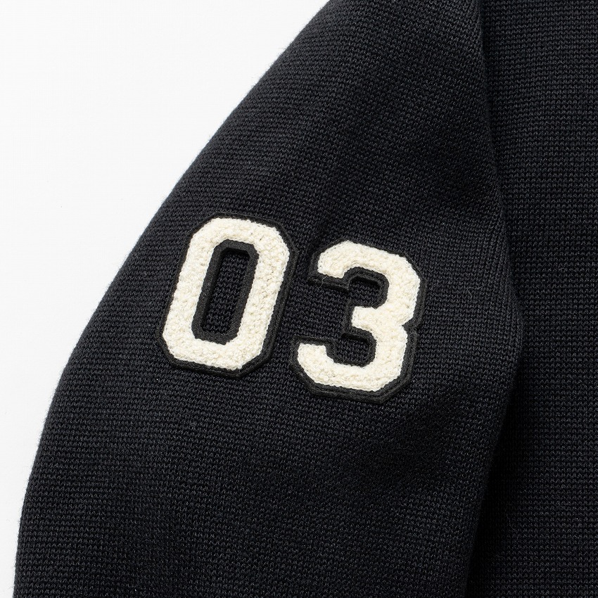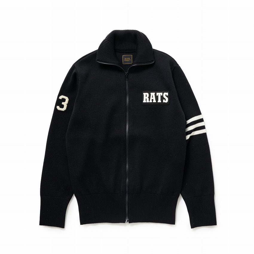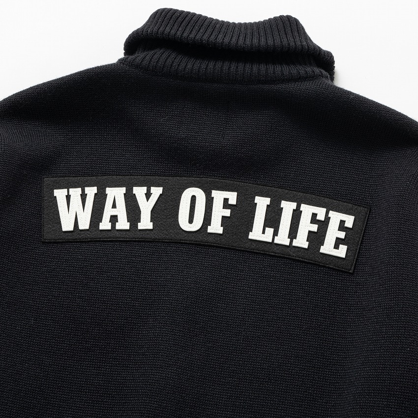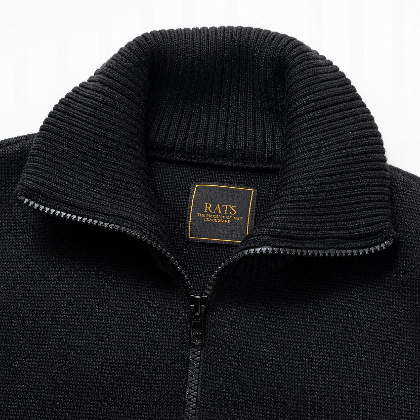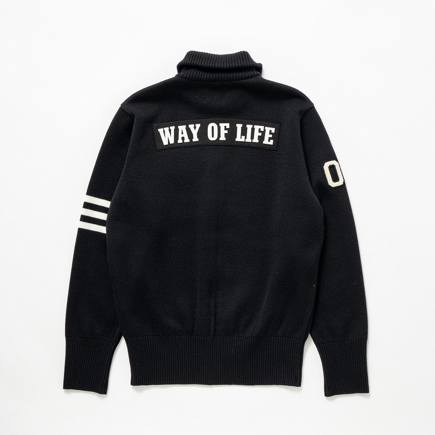 アクリル/ウール混紡ニット素材のドライバーズニット。ヴィンテージに見られるセーター同様、フロントはジップ仕様・スタンドカラー・タイトな身幅、という仕上がり。左胸にRATS・背面ヨークにWAY OF LIFEのフェルトパッチ、スリーブに“03”ナンバリングのサガラワッペンを叩きつけ。左スリーブに三本ラインをジャガードで表現。身幅はタイトなシルエット。