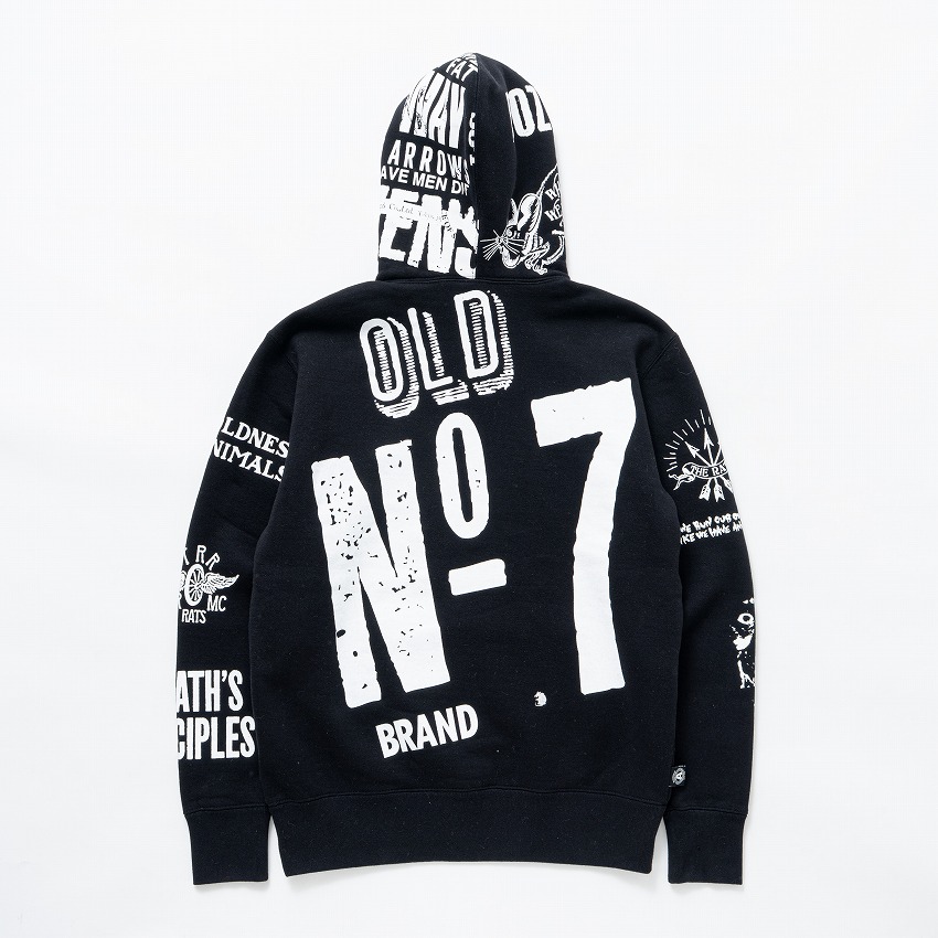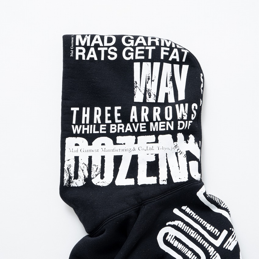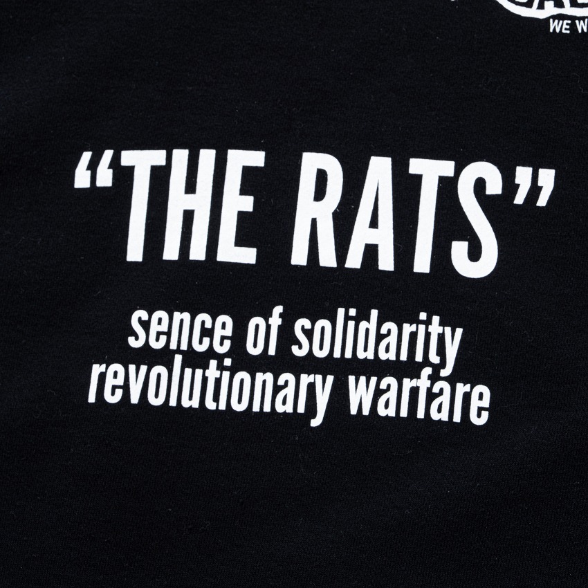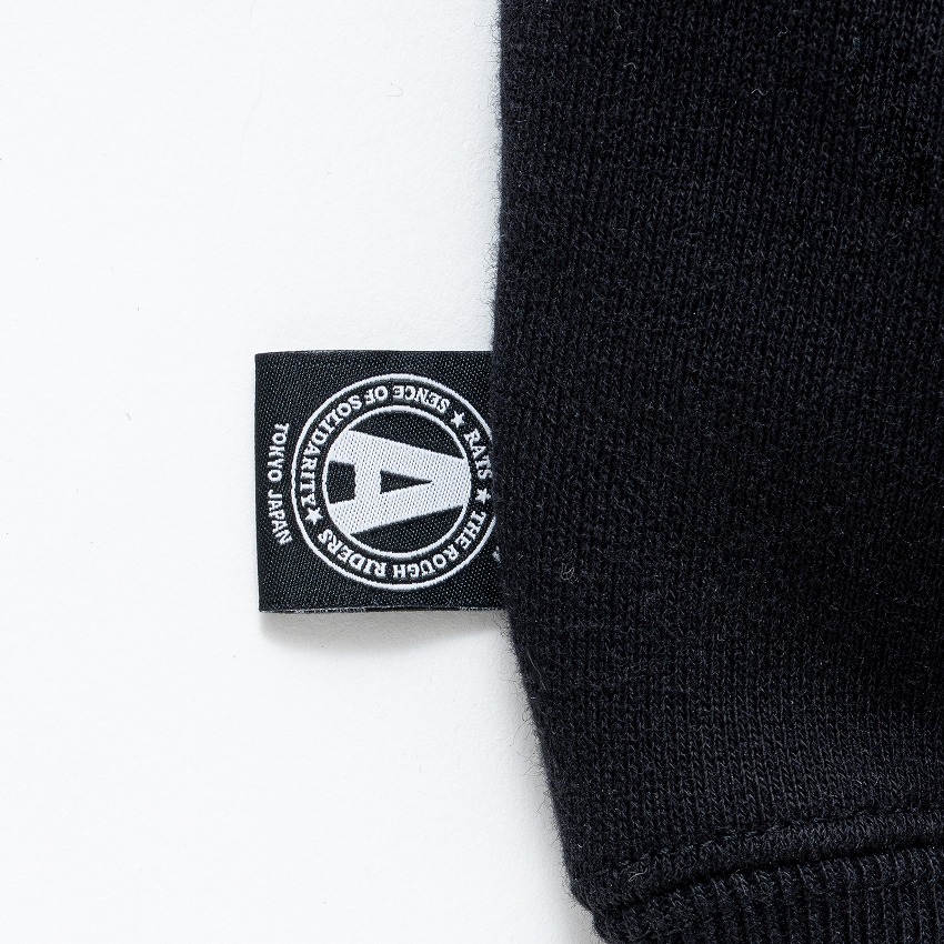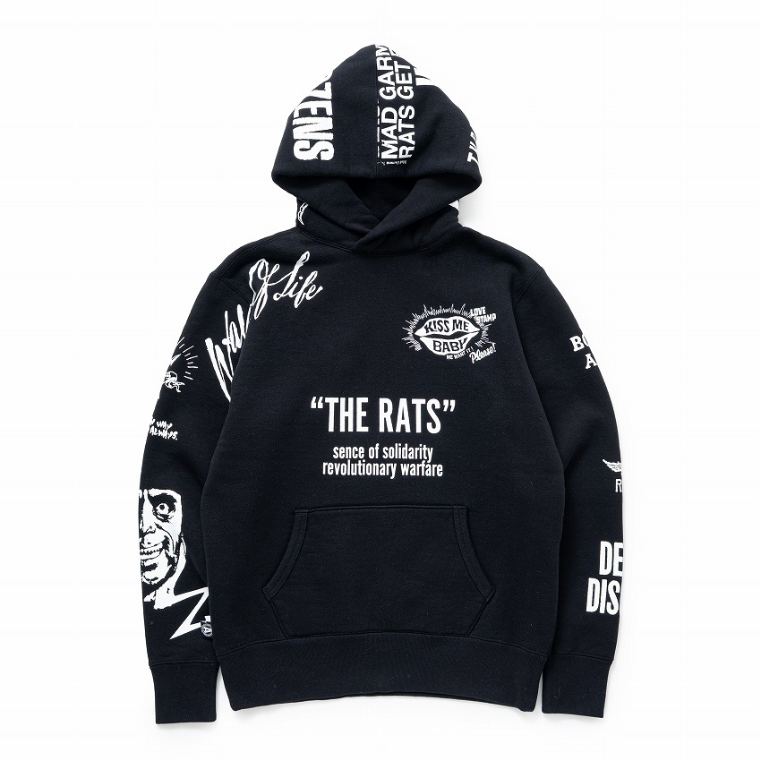 13oz.のコットン裏毛を起毛させた素材を使用したクロスネックフーディー。フロント・バック・スリーブの各所にRATSと交友関係の深いアーティストが手がけた歴代のアートワークをラバープリントで表現したインパクトあるデザイン。腹部にはポケット縁をバインダー仕上げをしたマフポケットを配置。襟元はブランドがオリジナルで開発したクロスネックに仕立てた防風性の高い意匠。身頃はややタイトなシルエット。製品にてワンウォッシュ済み。1色5サイズ展開。