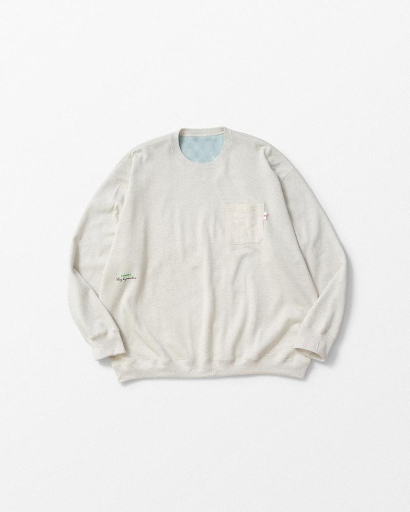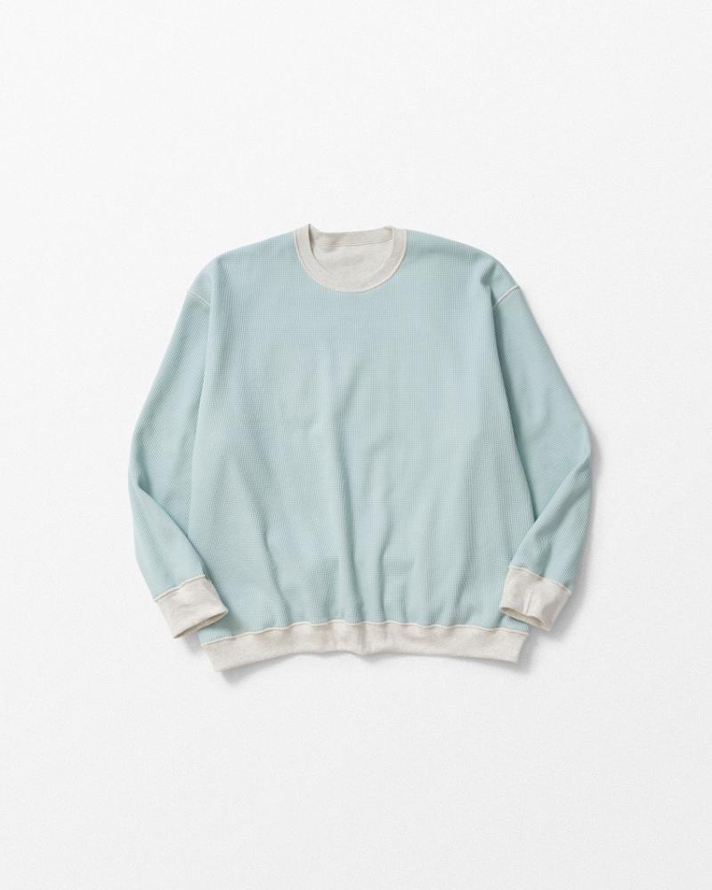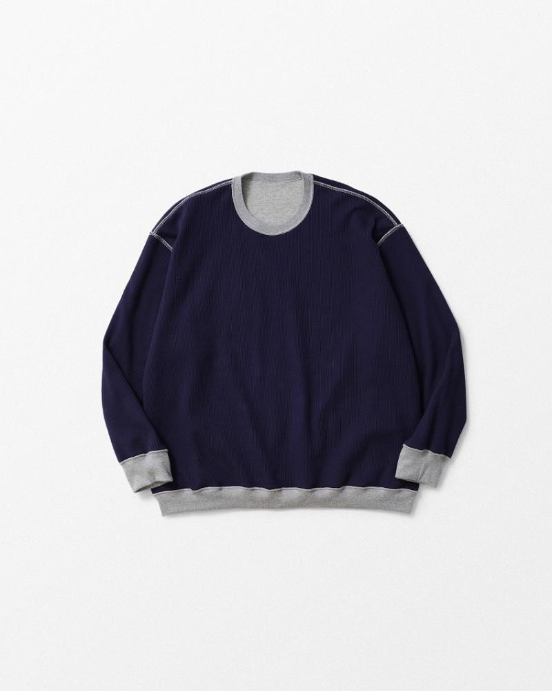 WHIZでは超珍しいダブルフェイスのカットソー。普段あんまりリバーシブルのアイテムは片方しか着ない事が多いのチョイスしない事が多いのはWHIZから滅多に出ないからかもしれません。そんな新作は一味違うどころの話ではありません。両面使いやすすぎて自身過去になく気に入ってしまった両面がA面のカットソーが登場してしまいました。特にオートミールの裏のライトブルーのサーマルなんて最高です。快適さを求めたダブルフェイスの表は粗ゲージで編み立てした柔らかなガーゼ調素材、そして裏には度詰めで編み立てたワッフル素材を使用しています。程よい厚みはスウェットくらいに収まっている万能使用は一枚でもインナーでも。そしてゆったりシルエットが功を奏して表裏の厚みを感じることなく着れます。とにかく便利で全色が使えすぎてとってもおすすめです。リバーシブルで表面を使う着方も楽しく、スウェット側の右わき下にはW20000706Dのデザインが入ります。そのワンポイントも嬉しい一枚をお楽しみくださいね。