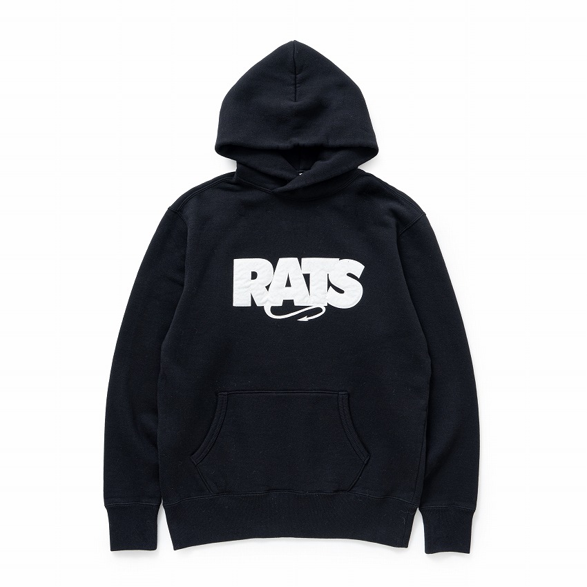 13oz.のコットン裏毛を起毛させた素材を使用したクロスネックフーディー。フロントにボックス型RATSロゴのフェルトパッチを配置、フェルト縁は千鳥刺繍で表現したデザイン。腹部にポケット縁をバインダー仕上げをしたマフポケットを配置。襟元はブランドがオリジナルで開発したクロスネックに仕立てた防風性の高い意匠。身頃はややタイトなシルエット。製品にてワンウォッシュ済み。