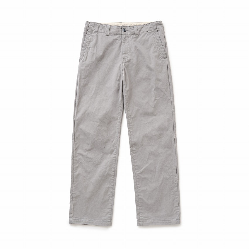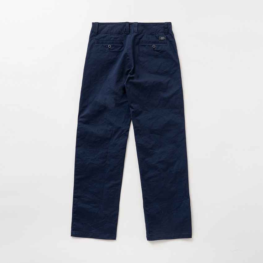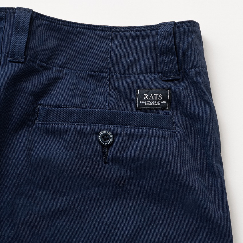 コットン/ポリエステル混紡の弱ストレッチ生地を使用したチノクロスパンツ。グレーはオリジナルカラー。生地表面が微起毛した質感が特徴。ウエストから伸びる様にステッチワークを配したスラッシュポケットを両脇に、背面左右にはボタン留め仕様の両玉縁ポケットを配置。右腰にRATSロゴの織ネームを叩きつけ。フロントボタン、ヒップポケットのボタンは“RATS”・“WAY OF LIFE”の刻印入りオリジナル。右腰下にスクウェアタグを叩きつけ。腿にゆとりのある、ヒップがコンパクトなストレートシルエット。ワンウォッシュ仕上げ。