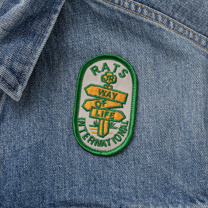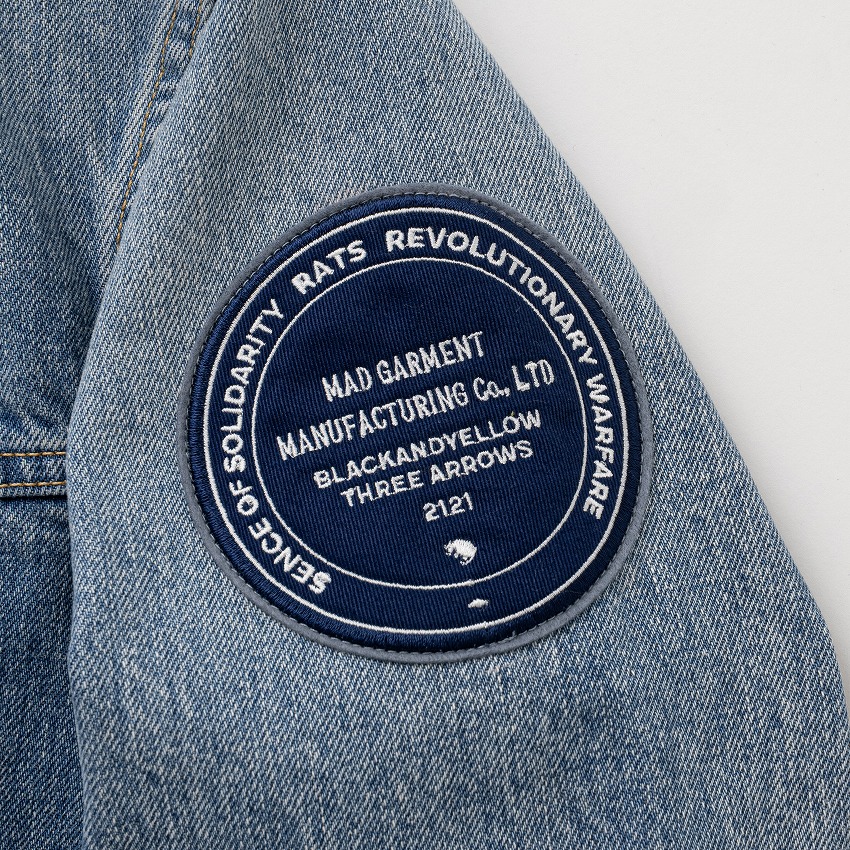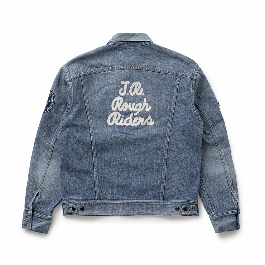 13.5oz.のデニム生地を使用したカスタムデニムジャケット。身頃全体にストーンバイオウォッシュ加工を施しヴィンテージなムードを演出、両胸・両肩にオリジナルで作成したワッペン、背面に“JR ROUGH RIDERS”のレターグラフィックをチェーン刺繍で表現したデザイン。両胸にフラップポケット、身頃の両脇にスラッシュポケットを配置。ボタンパーツは、“RATS”・“REVOLUTIONARY WARFARE“の刻印入りネオバーボタン。着丈、身幅、袖丈などはRATS流にアレンジしたレギュラーフィットシルエット。