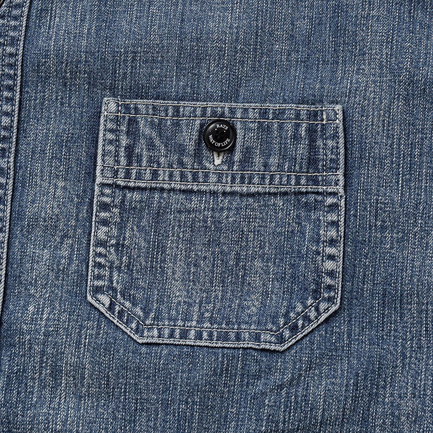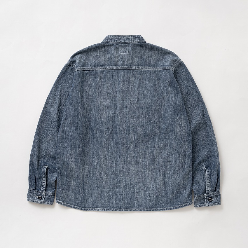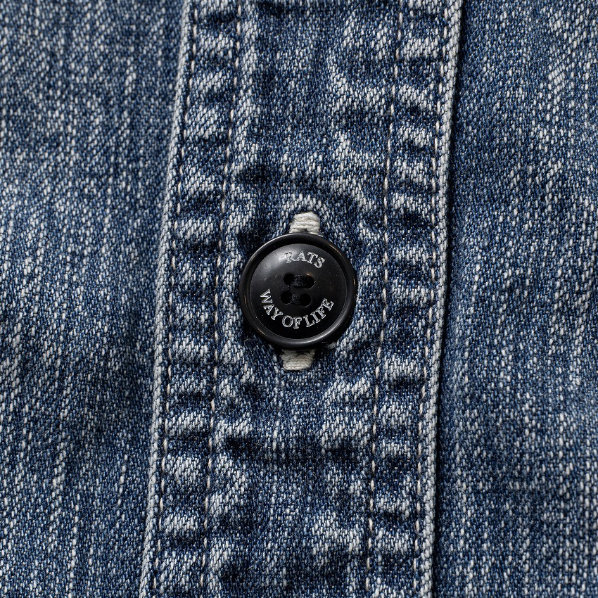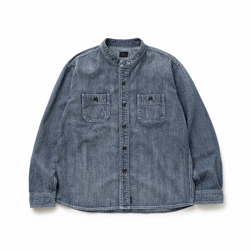 9oz.のライトなデニム素材を使用したスタンドカラーデニムシャツ。身頃全体にユーズド加工を施し、ヴィンテージ特有のドライタッチでフェードした質感を表現したデザイン。両胸にボタン留め仕様のフラップポケット、襟にはボタンを2連で配置、肩・脇・袖・背面などテンションのかかる箇所はすべて3本針仕上げ、などクラシックなワークウェアに見られる意匠を採用したデザイン。ボタンパーツはすべて“RATS”・“WAY OF LIFE”の刻印入りのオリジナル、前立て裾上にピスネームを挟み込み。レギュラーフィットシルエット。