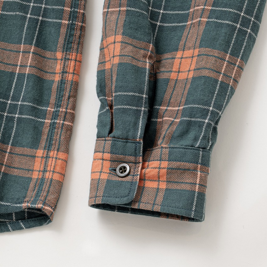 コットン/リネンの混紡素材を使用したレギュラーカラー仕様のチェック柄L/Sシャツ。両胸に敢えてバイヤスで仕上げたパッチポケットを配置、左ポケット脇にはピスネームを挟み込み。台襟仕立ての小ぶりな襟型、袖仕様はいってこい始末。ラウンドカット、レギュラーフィットシルエット。