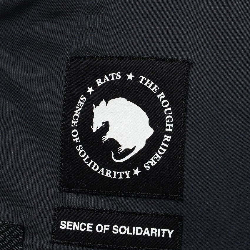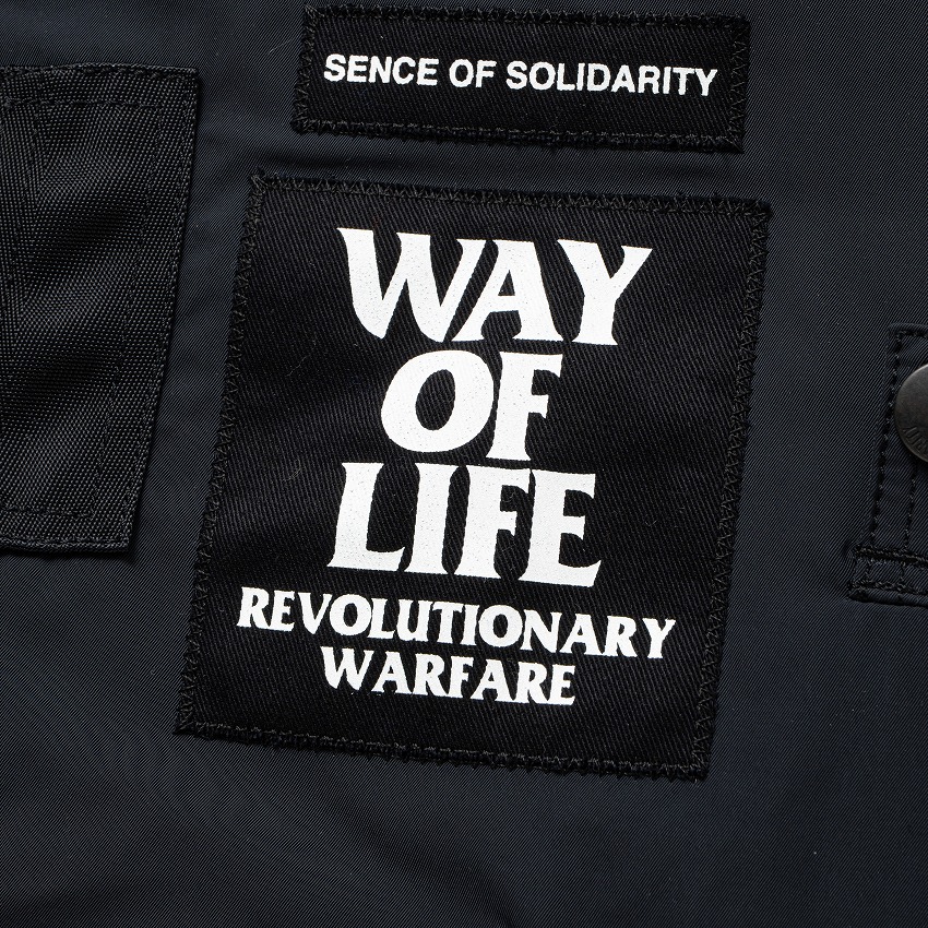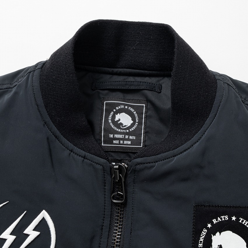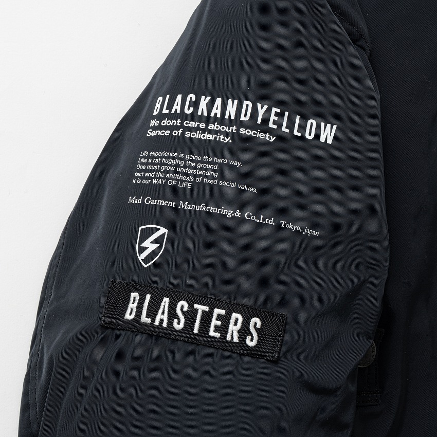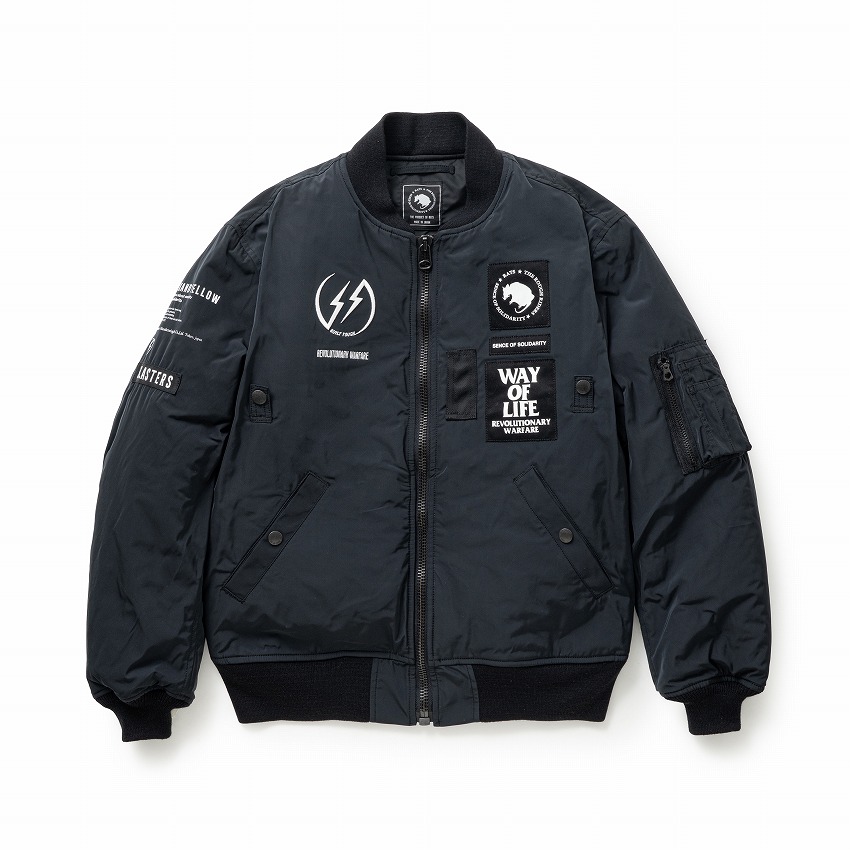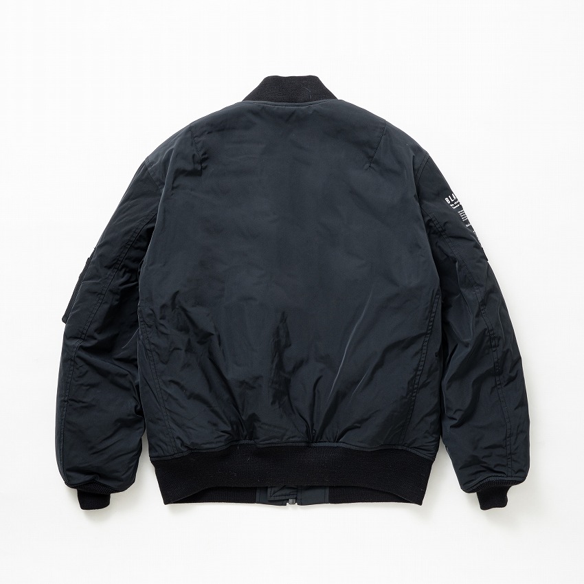 マットな質感、撥水性に富むオリジナルで作成したポリエステル生地を使用したMA-1ジャケット。着丈をやや長めに設計するなどシルエットは現代的ながら、中綿を詰め裏地に厚みを出したことで程よいボリュームと高い保温性を味わえる仕上がりに。身頃の内側にスラッシュポケット、ポケットライニングにはコーデュロイをセレクト。左胸にワッペン、右胸に3D刺繍、右肩にプリント・ナイロンテープをあしらった、高インパクトのデザイン。レギュラーフィットシルエット。