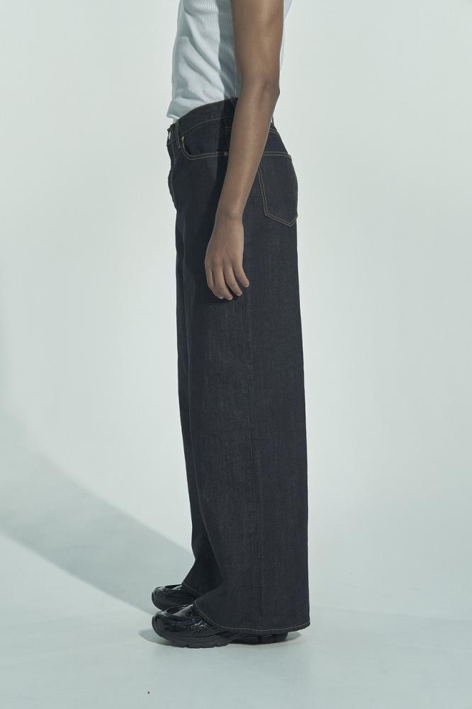 デニムブランド「HAGUN」とのコラボレーションアイテム、ワイドデニムのワンウォッシュバージョンになります。ウィメンズデニムのようにウエストまわりとヒップラインをすっきりと削り、裾に向かって大胆に広がるワイドシルエットに仕上げた一本です。バギーシルエットに近く、重心を裾側に持っていくことで腰回りをすっきり見せ、フレアのような足長効果を実現。さらに裾を絞ったような膨らみがないため、下半身をほっそりと見せる効果も期待できます。しっかりとした13.5ozデニムを使用し、ワンウォッシュ加工により落ち着いた印象に。程よいハリ感と落ち感を両立。動くたびに揺れるワイドラインが、洗練された印象を与えます。ミニマルなトップスと合わせるだけで、シンプルながら都会的でモードなスタイルが完成。デイリーからきれいめまで幅広く対応する、大人のためのワイドデニムです。