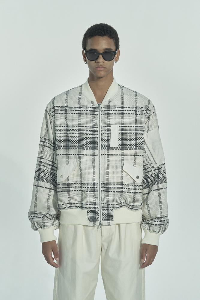 ブロックタイルチェック生地を使用したオーバーサイズのMA-1ジャケット。
