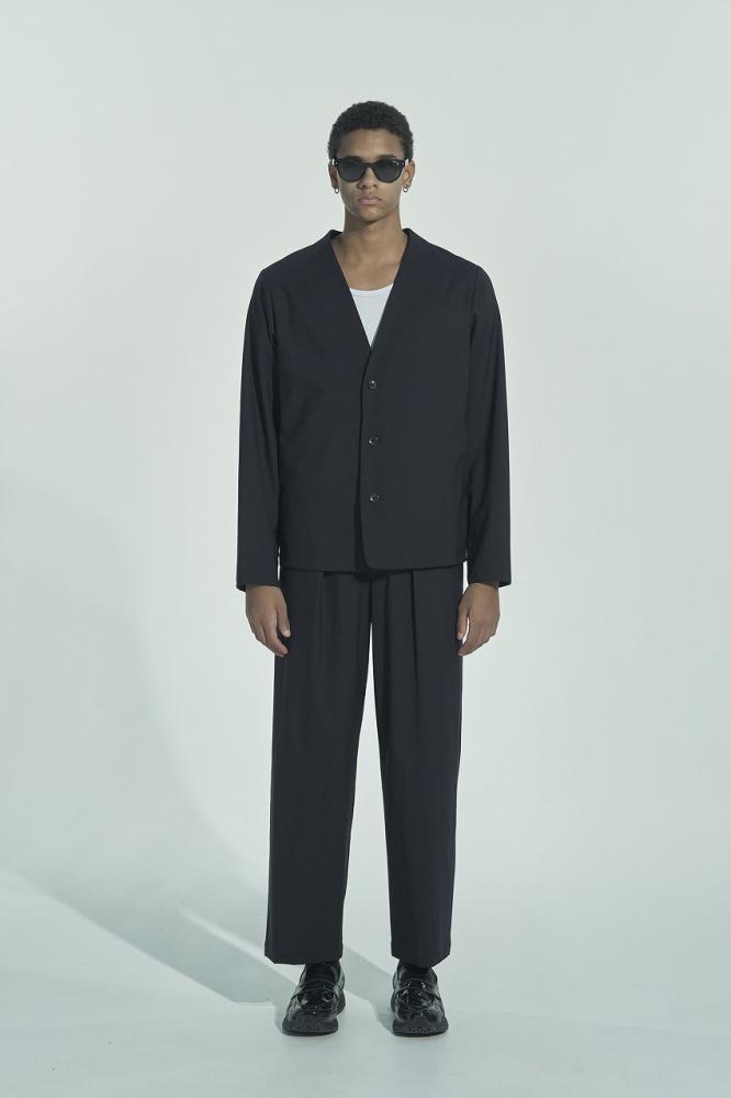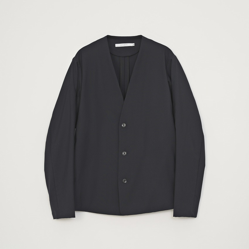 上質なウール100%を贅沢に使用したノーカラージャケット。ウールは通気性・吸放湿性に優れ、蒸れにくく温度調整がしやすい、夏にもとても快適な天然素材です。さらに、ウールならではの繊細な光沢としなやかな落ち感は、大人の装いに自然と“上質さ”を添える特別な存在。カジュアルになりがちな夏のスタイリングを、ウール100%ならではの高級感のあるサマーウェアへと格上げしてくれます。肌に触れたときのサラリとしたドライな質感は、気温の高い日でも心地よさをキープ。軽やかな着用感と自然な通気性で、冷房の効いた室内から外の暑さまで、幅広いシーンにスマートに対応してくれます。ノーカラーのすっきりとしたデザインは、品の良さと抜け感をバランスよく両立し、Tシャツ合わせでも大人の雰囲気を損なわない万能さが魅力。 同素材のグルカスラックスとのセットアップにも対応。統一感のあるコーディネートを、シーンに合わせて組むことができます。