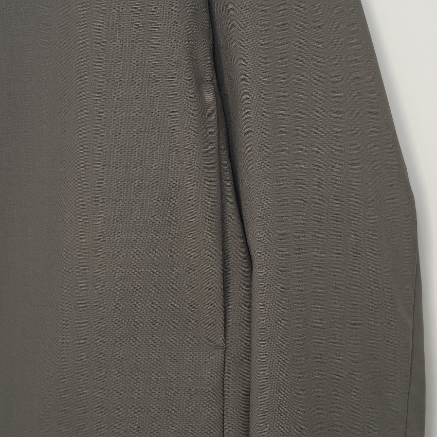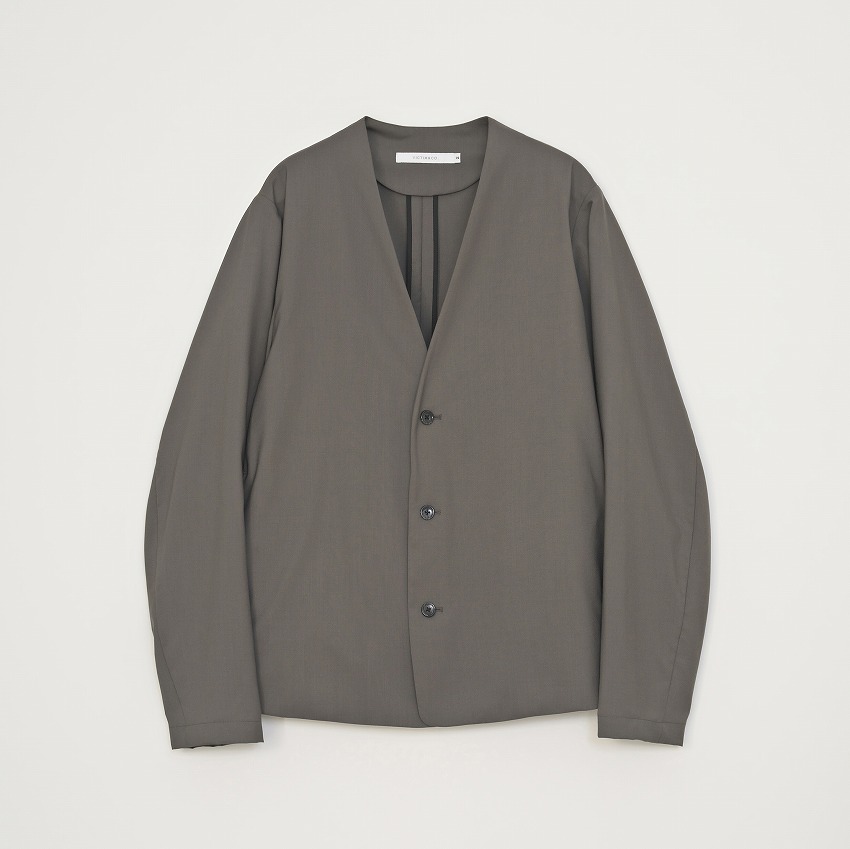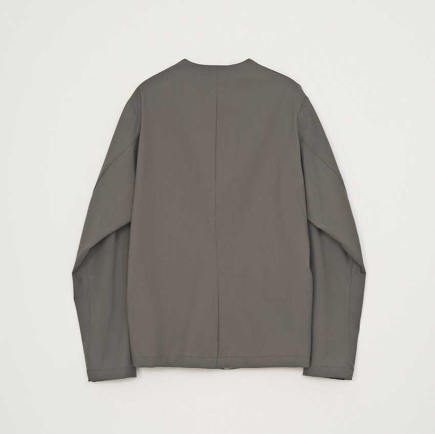 上質なウール100%を贅沢に使用したノーカラージャケット。ウールは通気性・吸放湿性に優れ、蒸れにくく温度調整がしやすい、夏にもとても快適な天然素材です。さらに、ウールならではの繊細な光沢としなやかな落ち感は、大人の装いに自然と“上質さ”を添える特別な存在。カジュアルになりがちな夏のスタイリングを、ウール100%ならではの高級感のあるサマーウェアへと格上げしてくれます。肌に触れたときのサラリとしたドライな質感は、気温の高い日でも心地よさをキープ。軽やかな着用感と自然な通気性で、冷房の効いた室内から外の暑さまで、幅広いシーンにスマートに対応してくれます。ノーカラーのすっきりとしたデザインは、品の良さと抜け感をバランスよく両立し、Tシャツ合わせでも大人の雰囲気を損なわない万能さが魅力。 同素材のグルカスラックスとのセットアップにも対応。統一感のあるコーディネートを、シーンに合わせて組むことができます。