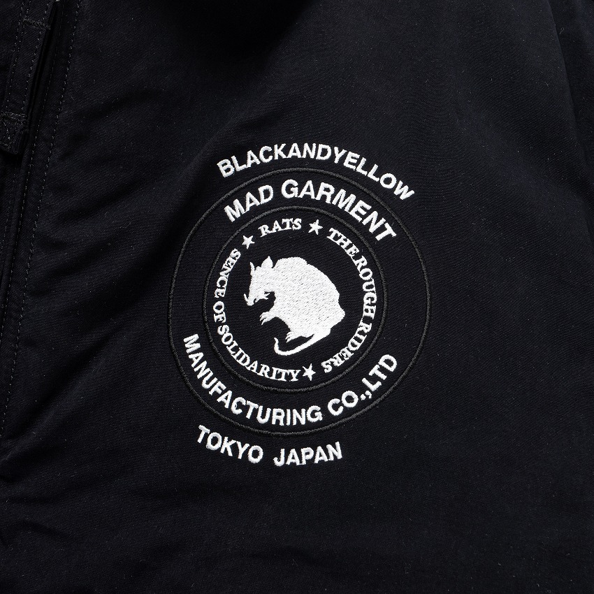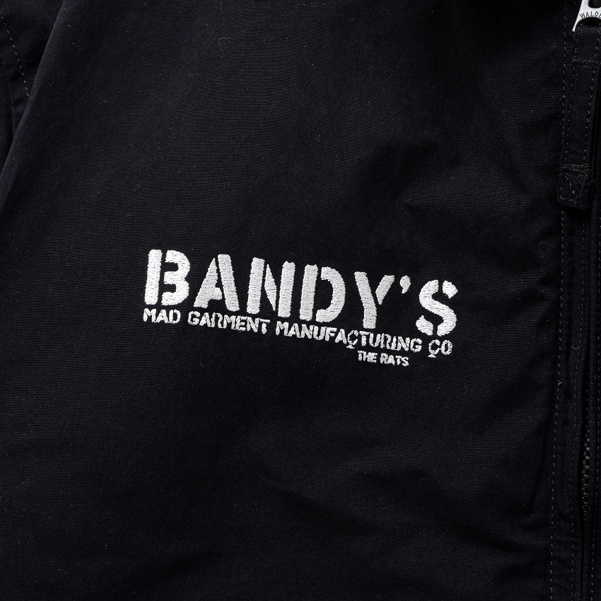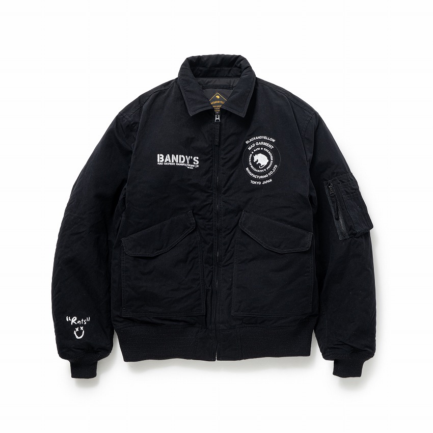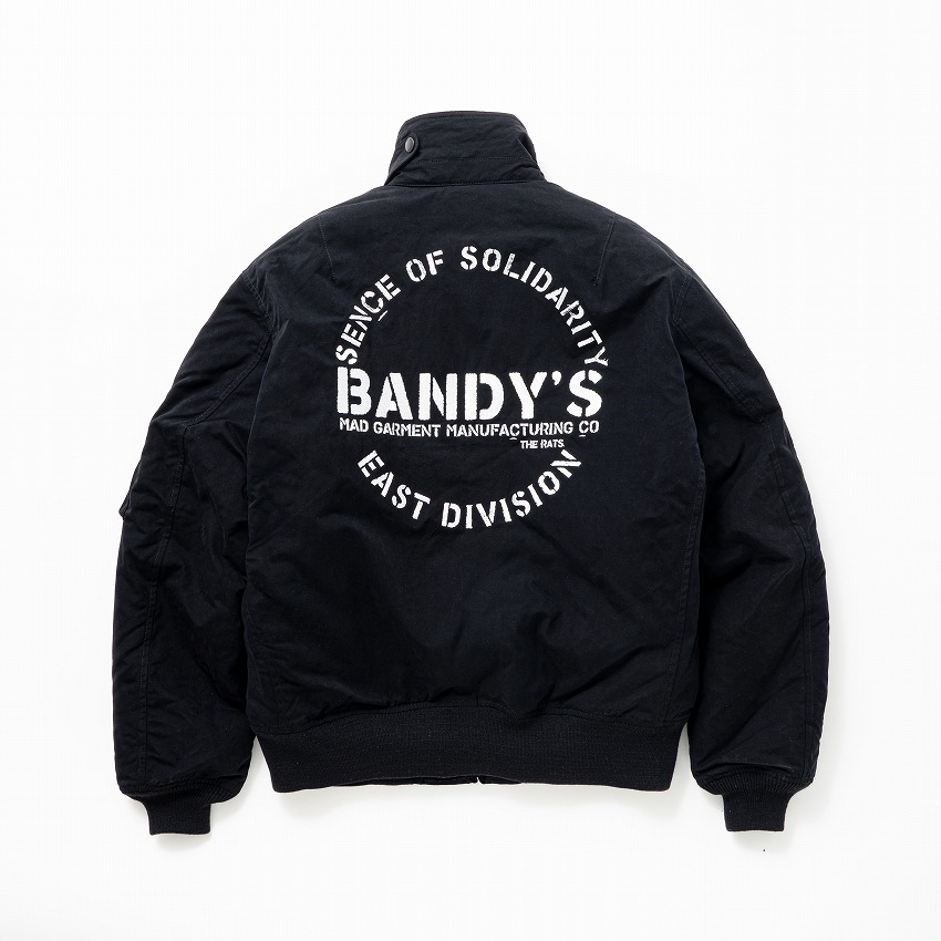 撥水性・防風性に富むコットン/ポリエステル/ナイロンの3種混生地とナイロンライニングを使用したCWUジャケット。元々は米軍がインターミディエイトゾーン用に開発したフライトジャケット。左胸にサークル型ワッペンを叩きつけ、右胸にBANDY’Sレター・背面にサークル型アートワークを直刺繍で表現するなど、RATSが掲げるメッセージやアイコンを随所に散りばめたデザイン。両腰にフラップポケット、ポケット外側にスラッシュポケット、身頃内側にボタン留め仕様のポケットも配置。レギュラーフィットシルエット。