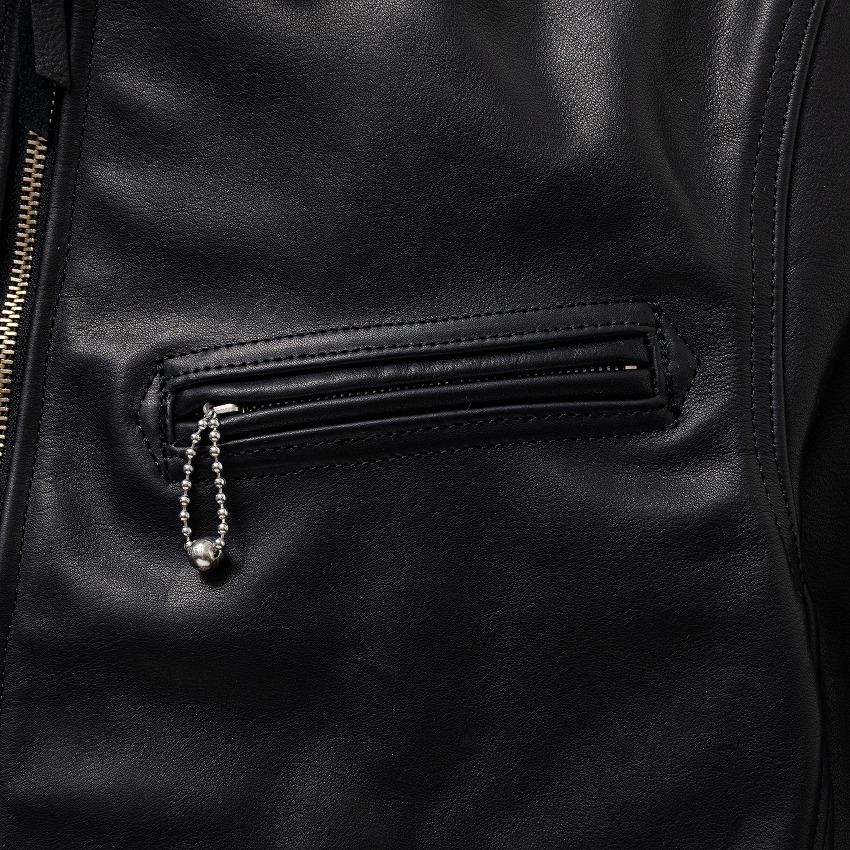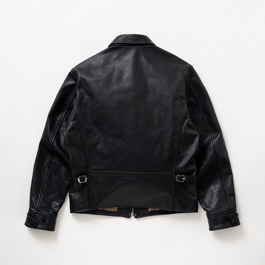 30sに見られるクラシックなムードのスポーツジャケットをベースにRATSが独自に仕上げたレザージャケット。重厚かつマットな質感のカウレザーを使用した1着。袖口のカフ形状、裾の帯幅、胸にボールチェーン付きファスナーポケットを配置するなど、ヴィンテージに見られる意匠を各所に反映することで説得力のあるムードに仕上げてある。ライニングには光沢豊かなキュプラ地、左身頃裏にスリットポケット、両脇にバックル付きアジャスターベルトを採用。着丈はやや短め、身幅はタイトフィットなシルエット。