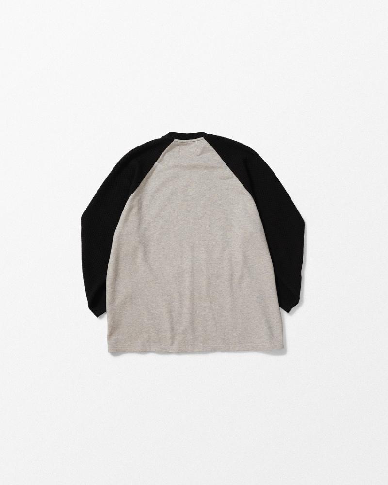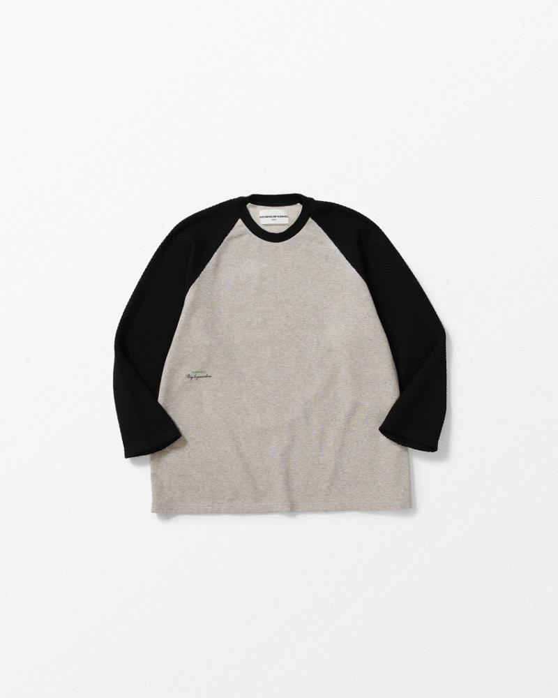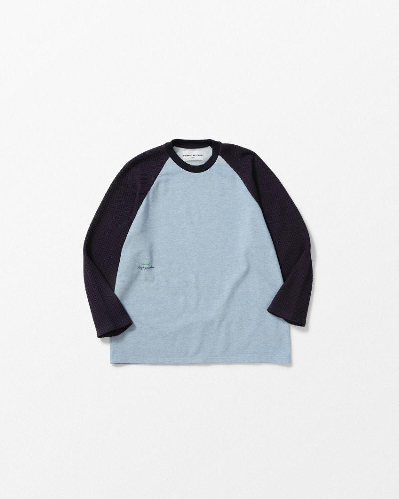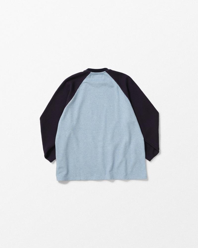 春な丈のWHIZらしいラグランスリーブカットソー。一見シンプルに見えますが袖とボディは生地が変化しています。袖にはしっかりしら太番手の糸をローゲージ機で編み立てた、ざっくりした立体的なラッセル編みのカットソー地を使用してボディ部分はオーガニックコットンを使用した爽やかなカラーの薄手のスウェットになっています。生地で変化をつけて脇には小さくWHIZのデザインが入るラグランスリーブです。着て見て触ると生地が違ってしっかりデザイン。そんなこだわりのカットソーをどうぞお楽しみくださいね。きっといつもついつ選んで着ちゃう、そんな一枚です。