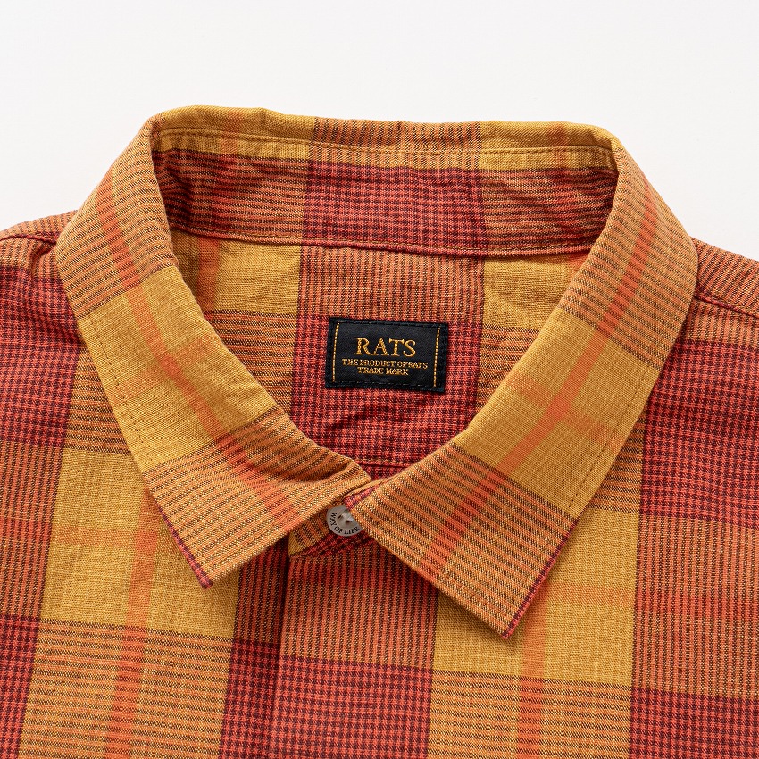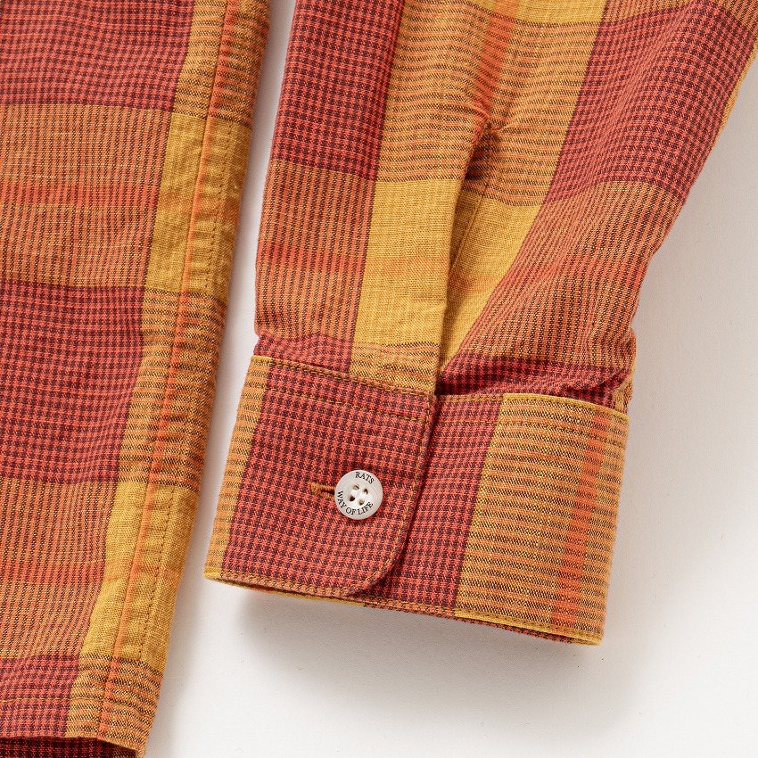 オリジナルのコットン先染め素材を使用したレギュラーカラーチェックシャツ。ポケット・脇下も柄合わせを行った手の込んだ仕上がり。左胸にパッチポケット、ポケット脇にピスネームを挟み込み。袖仕様はいってこい始末、襟は小ぶりなレギュラーカラーの台襟仕立て、ボタンパーツはすべて“RATS”・“WAY OF LIFE”の刻印入りのオリジナル。クラシックなワークシャツに見られるボックスシルエット。1色、5サイズ展開。