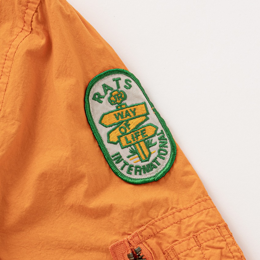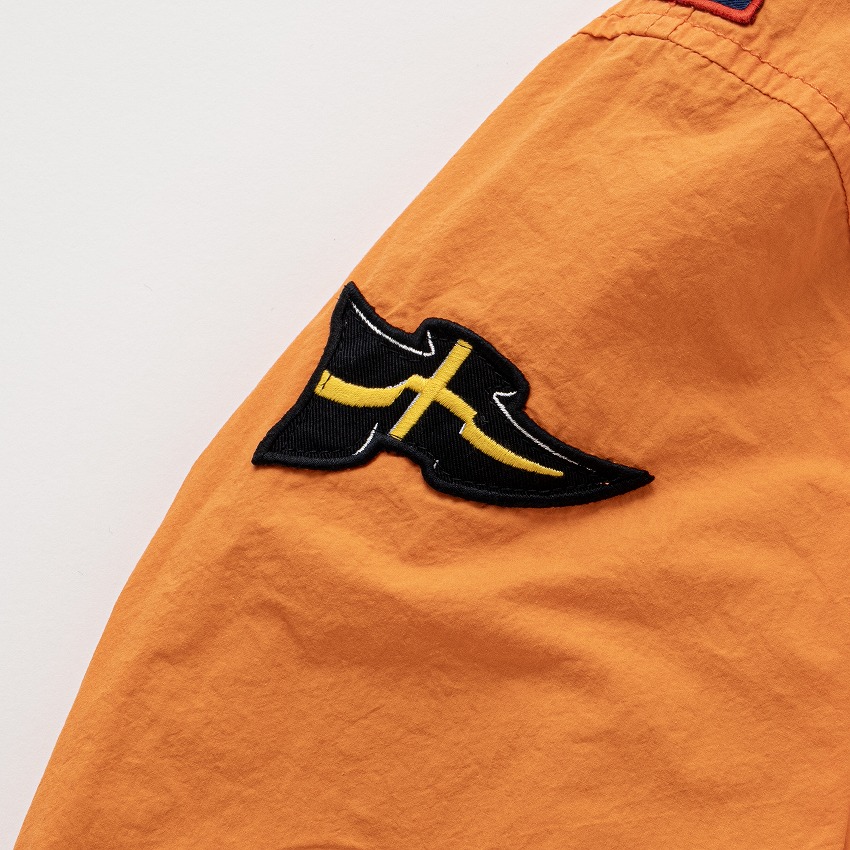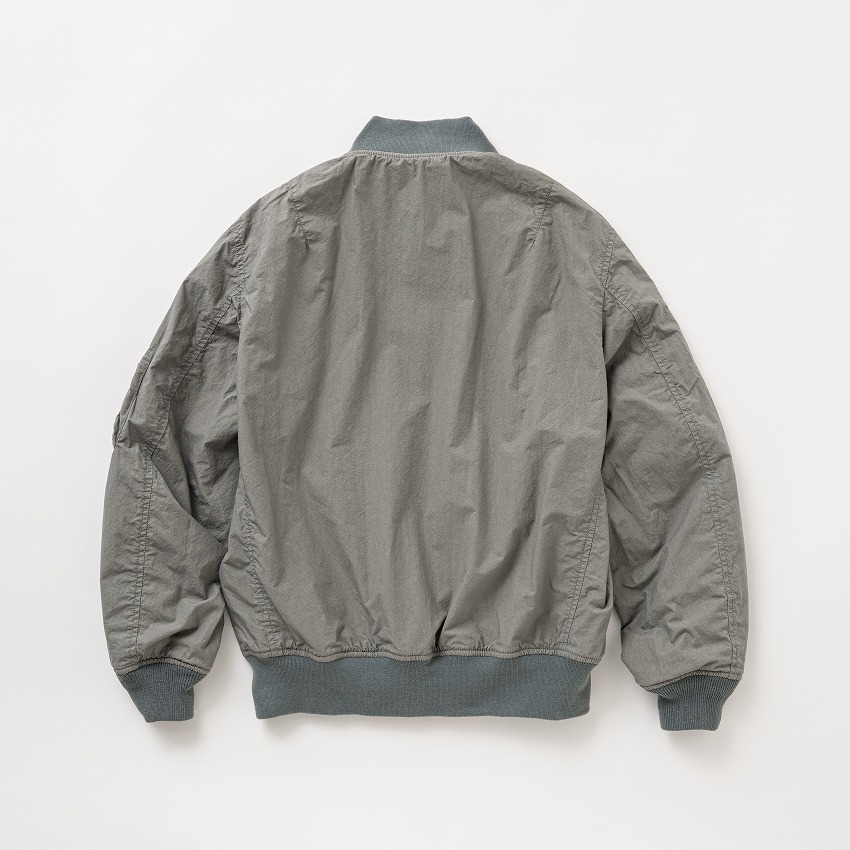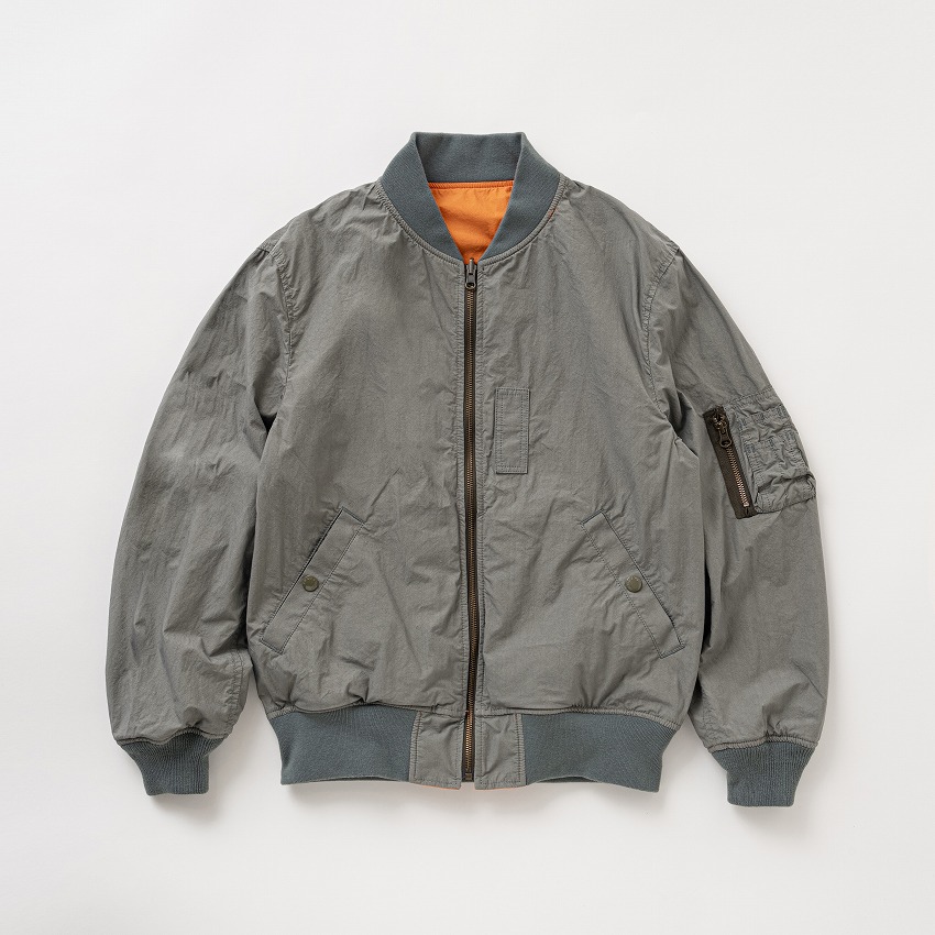 オリジナルで染色したコットンタイプライター素材を使用したMA-1ジャケット。オレンジ面・グレー面の両A面のデザインで構成したリバーシブル仕様。中綿を入れないことでライトに羽織ることが可能。オレンジ面は左胸、両肩、両袖にオリジナルで作成したワッペンが配置、グレー面は装飾を廃してソリッドに仕上げてある。左腕にシガレットポケット、身頃の両脇にスラッシュポケット、胸元のオキシジェンタブは両面ともに共通の意匠。レギュラーフィットシルエット。