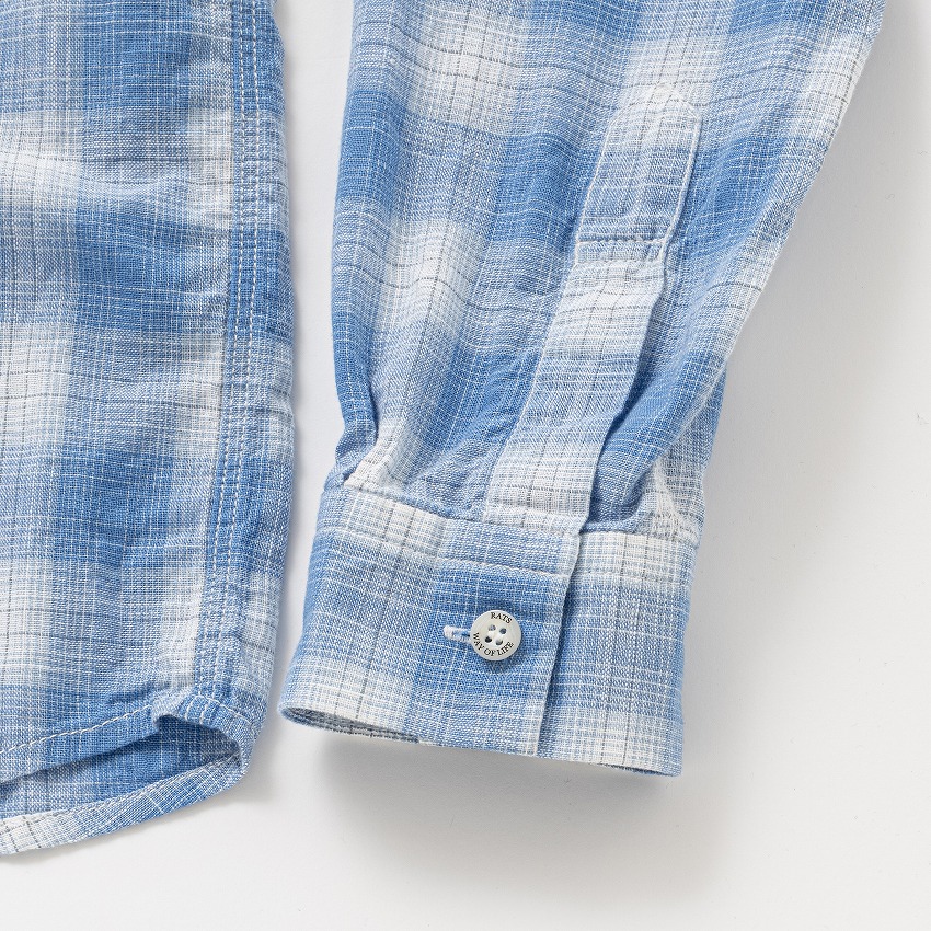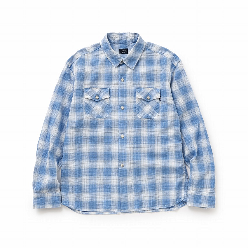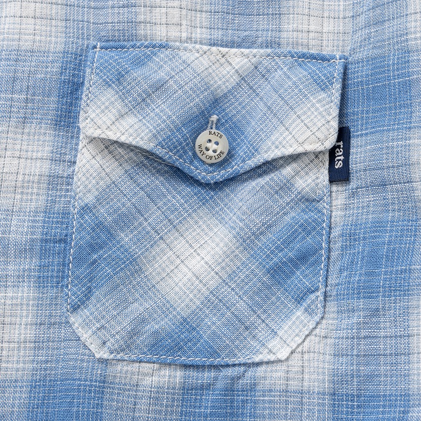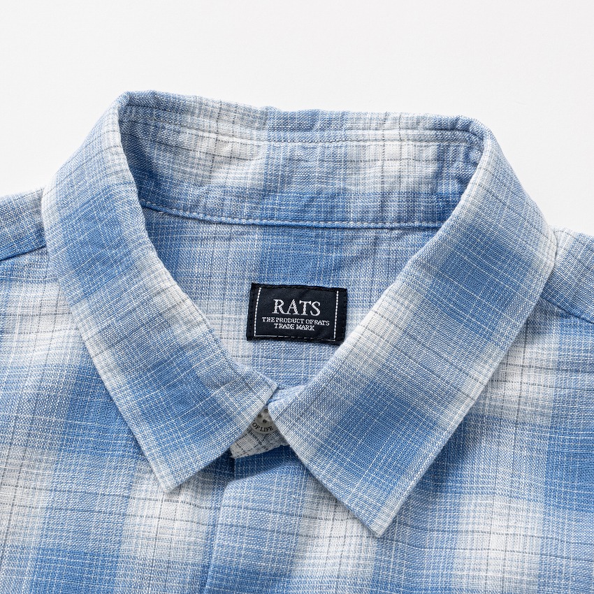 オリジナルのコットン先染め素材を使用したレギュラーカラーチェックシャツ。両胸にフラップポケット、左ポケット脇にピスネームを挟み込み。袖仕様は剣ボロ仕立て、襟は小ぶりなレギュラーカラーの台襟仕立て、ボタンパーツはすべて“RATS”・“WAY OF LIFE”の刻印入りのオリジナル。クラシカルなカッティングをした特徴的なポケットフラップデザイン。裾は緩やかなラウンドカット、レギュラーフィットシルエット。