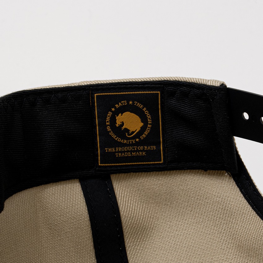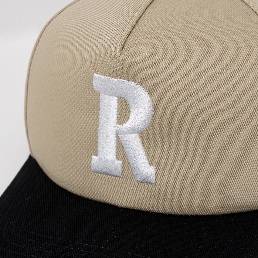 ハリ・コシに優れるコットンカツラギ素材を使用したベースボールキャップ。フロントパネルにRロゴの立体刺繍、右側面にサークル柄モチーフをラバープリントで配置したデザイン。後部中央にスナップバックアジャスターを付属、サイズ調整が可能な仕様。1色1サイズ展開。