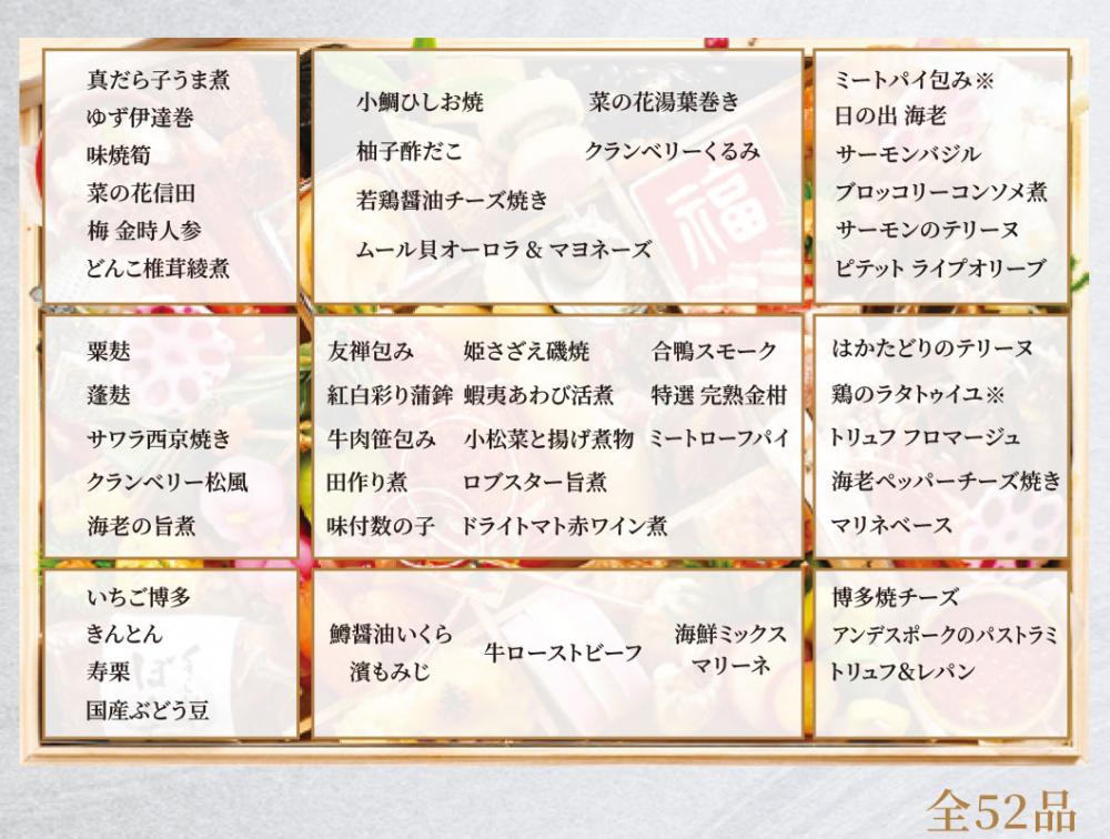 今年のお節は歴代最多の52品を一段重に詰め込んだ贅沢なお節になっております。