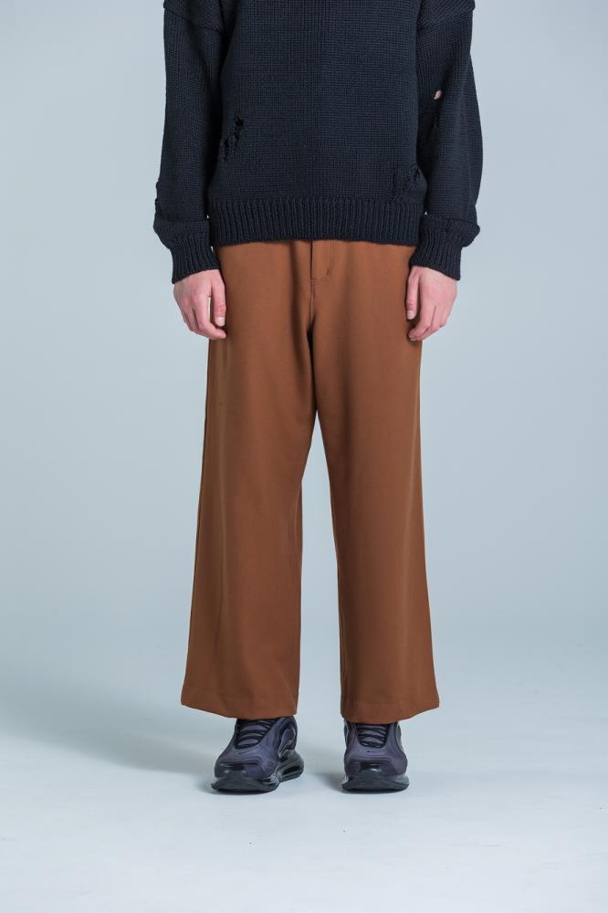 ストレッチの利いたポリエステル×レーヨン生地を使用した5ポケットのワイドパンツ。
