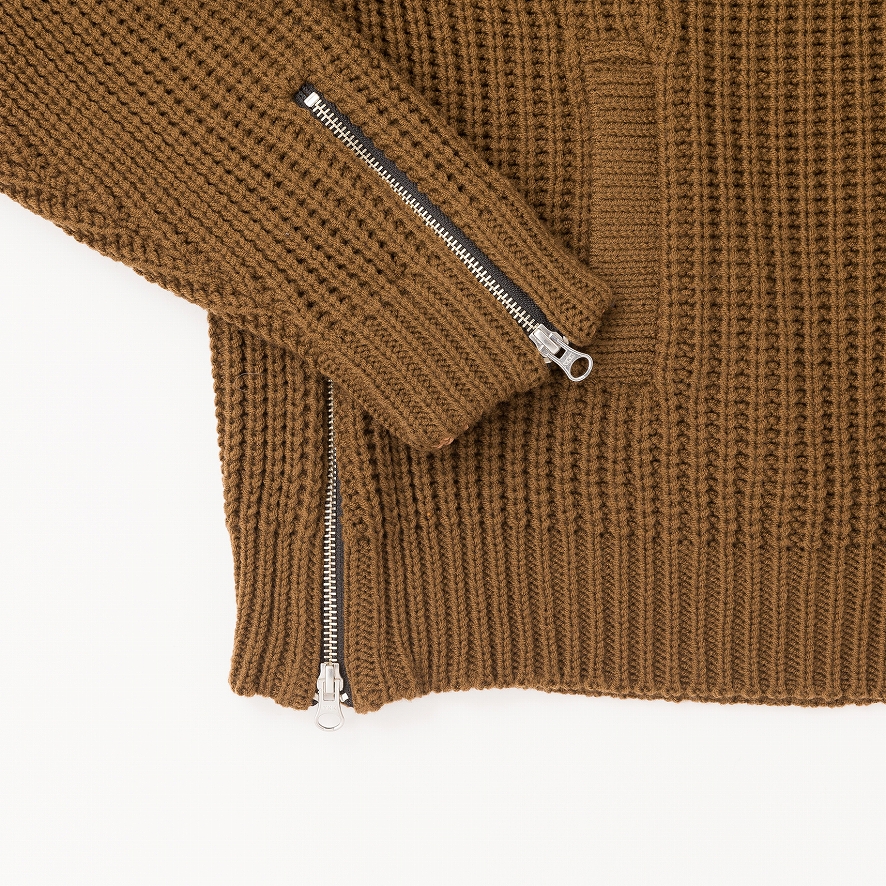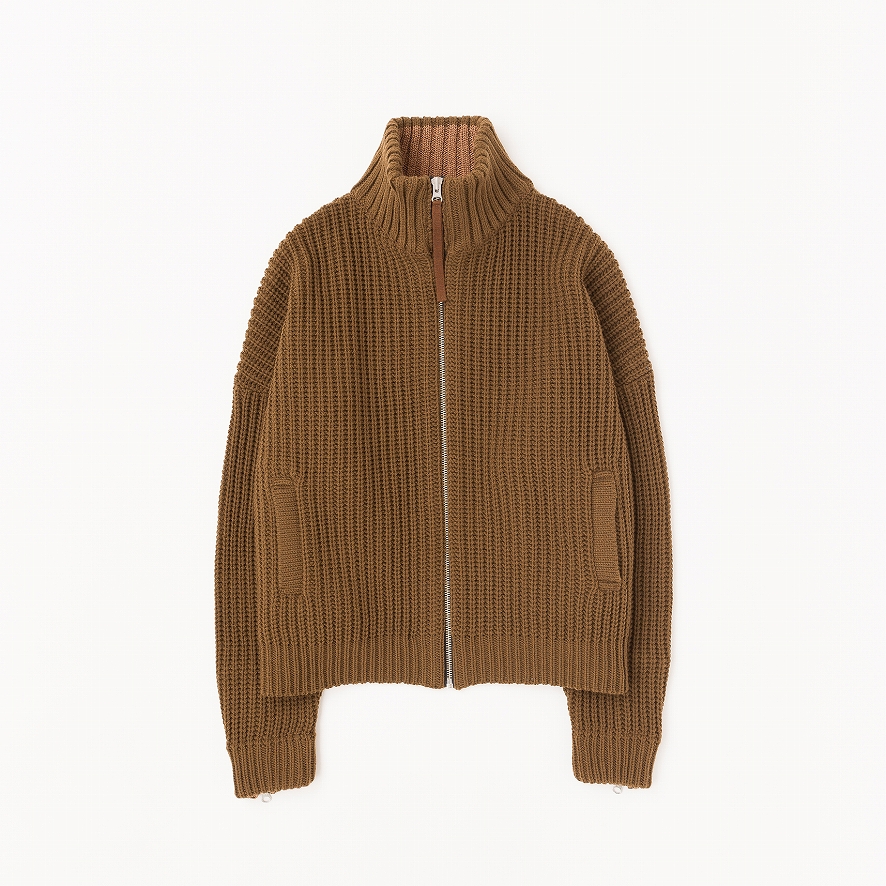 肌触りがよく、柔らかなアクリル×ウールの糸を3ゲージで編んだフルジップのニット。